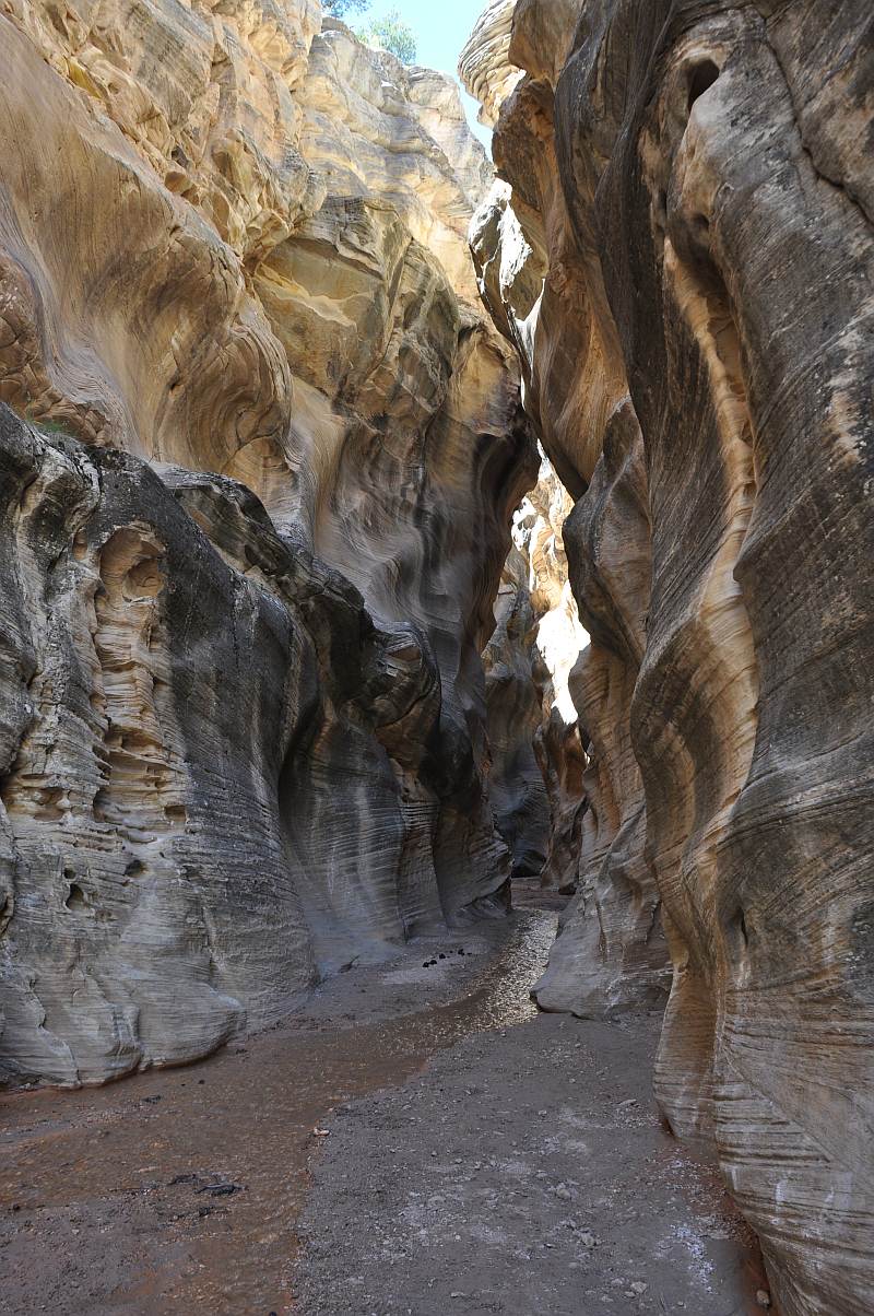Es folgt ein einfacher 45 min Hike zum Slot. Nur ein anderes Pärchen ist dort. Er hat sich mit seiner EOS D-5 im Canyon verschanzt. Als er uns sieht, gibt er Gas und wir sind nach 10 min alleine für uns im Canyon. Unbeschreiblich. Das ist der mit Abstand schönste und beeindruckendste Slot in dem wir bisher waren. Das Licht ist perfekt und die Strukturierungen der Wände kommen perfekt zur Geltung: Woher der Slot seinen Namen hat ist nicht schwer zu erahnen...